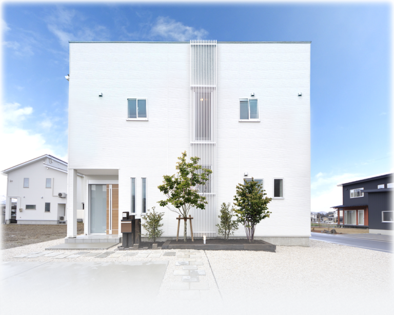 白とシルバーを基調としたシンプルモダンな外観、枕木の花壇にはブナとサカキ、石畳のアプローチで上品に仕上げました。夜になるとFIX窓から漏れる灯りが暖かで印象的な家になりました。