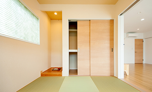 琉球畳の4.5帖の和室、モスグリーンの和紙風プリーツスクリーンが柔かな風合いです。押入れ収納とシンプルな床の間。段差のない敷居、引戸を閉めるとリビングと仕切ることができます。