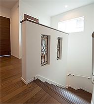 廊下からアーチをくぐると吹き抜けの階段。採光窓もあり2階まで明るいです。手すり部分にはお洒落なロートアイアン飾りを施工しました。