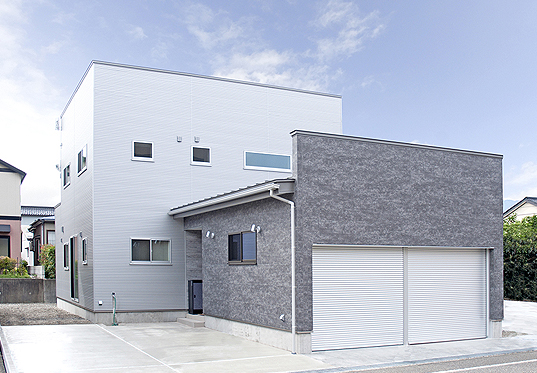 メタルシルバーとグレーパネルの外壁のスッキリとした外観。