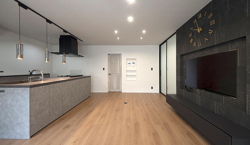 スマートなガラスのハイスライドドアと壁一面に広がるテレビボードが印象的。凹凸のあるアクセントクロスに壁掛けテレビを組み合わせ上質で個性あふれるリビング空間に仕上げました。